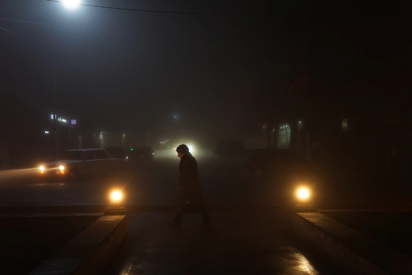 亚美尼亚边境小城歌里斯,下完雪后一片大雾,一个穿着苏式衣服的妇女路过街边公园路口,这景象仿佛看到了以前苏联的样子。