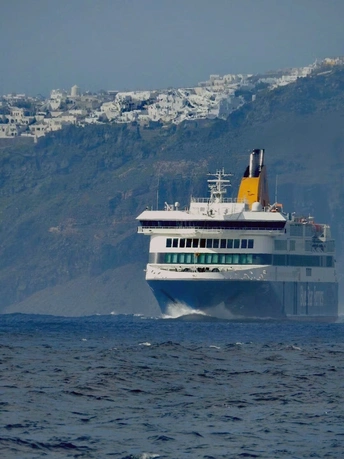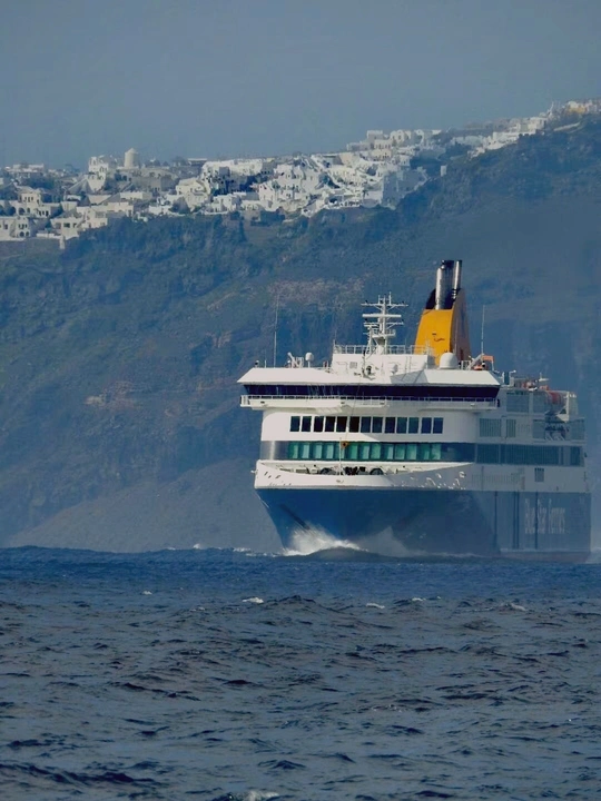 雅典到圣托里尼的“蓝星”系游轮正驶入圣托里尼港