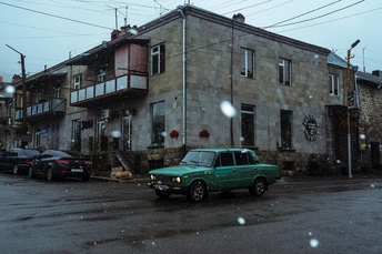 亚美尼亚,一场大雪,一辆拉达汽车,苏联时期的房子。