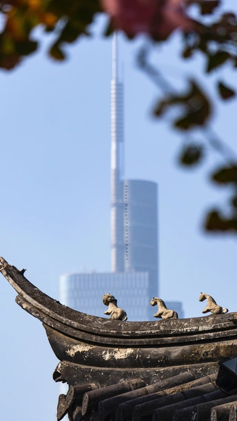 古鸡鸣寺的飞檐和远处的紫峰大厦