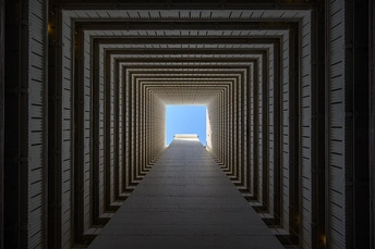 香港的居民楼素以建筑密度大闻名。在香港有诸多类似构图的居民楼天井,成为香港城市摄影的打卡地。位于九龙半岛东部的坪石村是其中较有特色的一处。因为其天井外观比较整齐干净,且其中一面为实墙,视觉上犹如一条通天大道