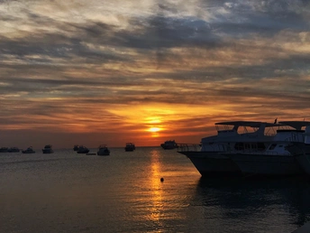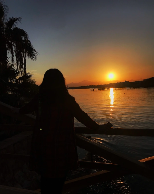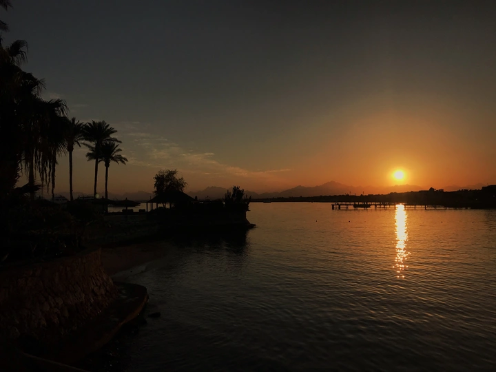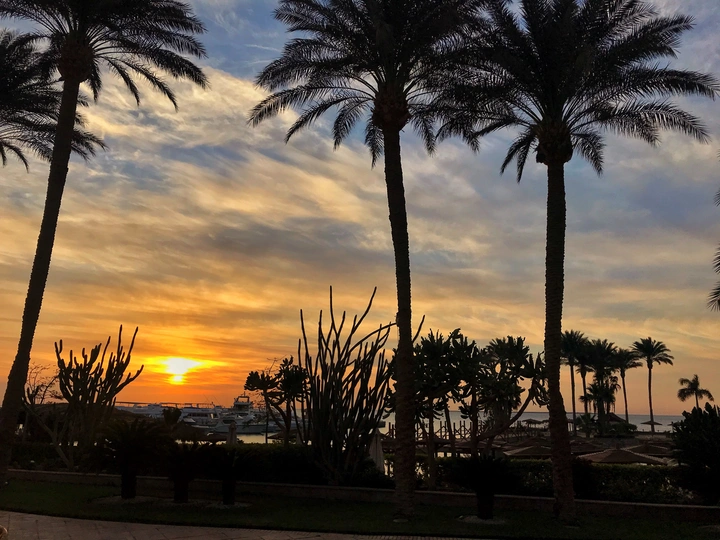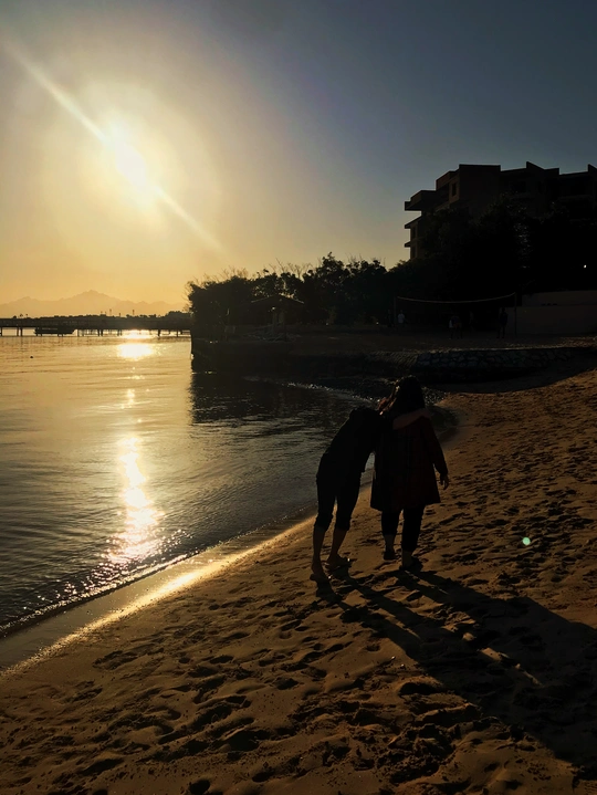 看着这酒店迷人的晚霞 我们一家高兴地看着 忘掉了过去烦恼 跟着红海的霞光前行。