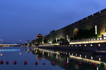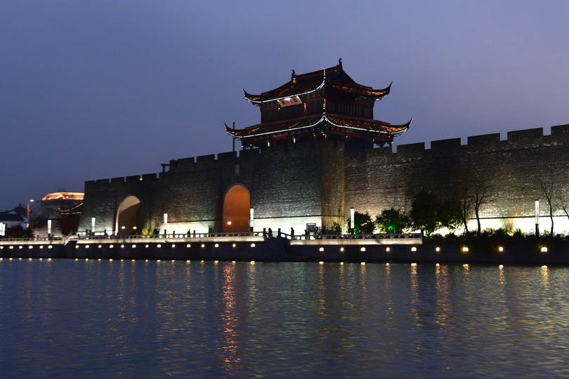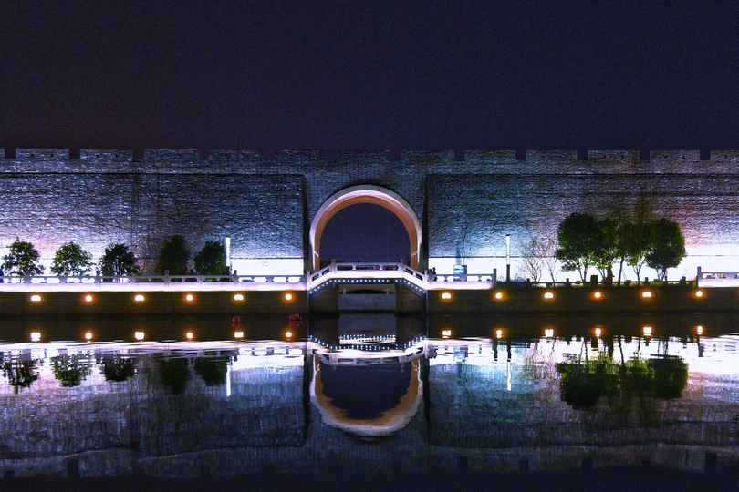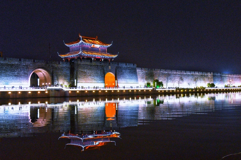 摄于江苏苏州相门。【归自谣 夜游姑苏相门】波潋滟,碎影霓光多变幻,星河舟荡轻烟漫。朦胧夜色阑珊岸,城楼灿,巍峨千古依河畔。