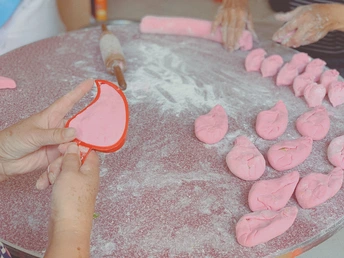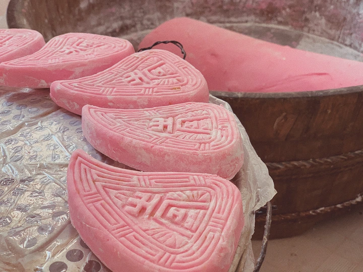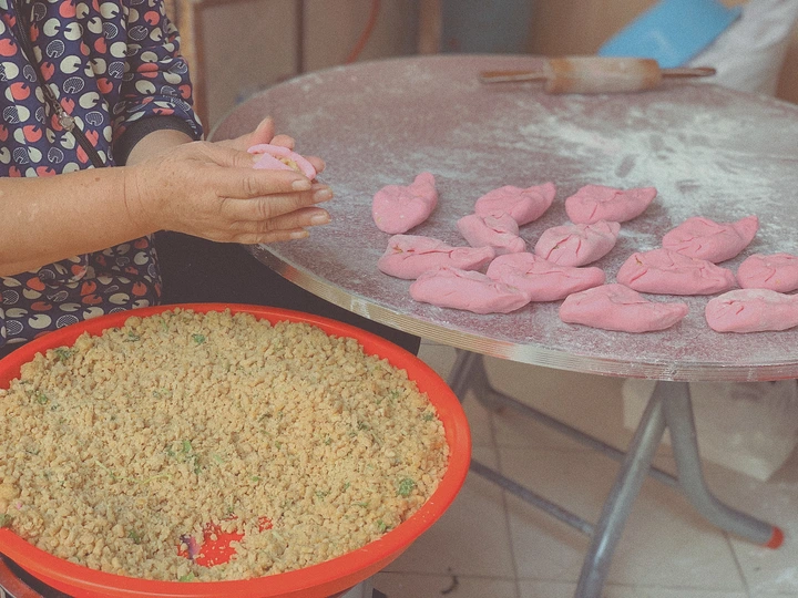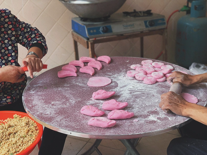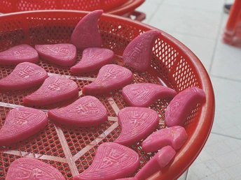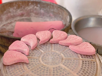 潮汕粿类品种特别多,这种名字叫红桃粿,潮汕地区有很多当地节日,凡时年八节,几乎家家户户都要做红桃粿用来祭拜神明,祈祷家人安康、生活顺心。因为外形很像寿桃所以很受潮汕地区的欢迎。红桃粿主要有糯米、香菇、虾米等调配而成的馅料,把做好的粿蒸熟之后即可食用,也可略微用油煎,更是一种家的味道。