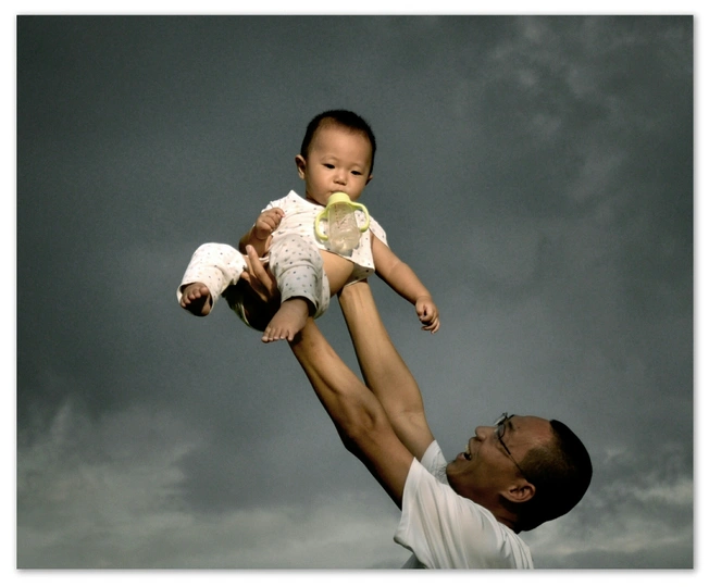乌云下的天空,有一束光普照大地,正好照射在正在草地上学爬的baby,于是我急忙讲baby举起拍下这张图片。