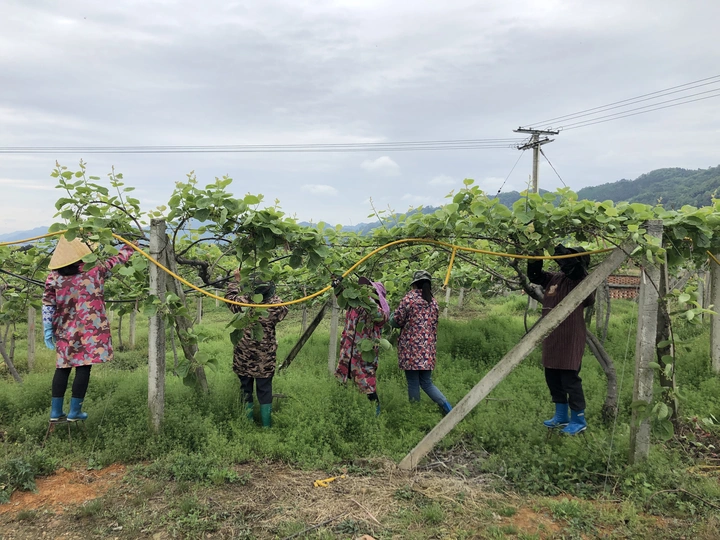 蒲江县,隶属于四川省成都市,位于成都、眉山、雅安三市交汇处,盛产水果、茶叶,有天然氧吧,绿色蒲江之称。在成都蒲江朝阳湖附近的山上,偶遇猕猴桃种植基地,工作人员正在进行疏花蕾(清理掉小花蕾、畸形蕾、病虫蕾等),猕猴桃原产地在中国,近代才引入新西兰,大家熟悉的名称奇异果,只是人工选育的一个品种。现在所有进口的猕猴桃都来源于最开始引入新西兰的种子…