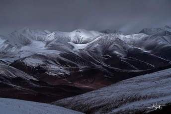 驱车前往慕士塔格冰川。由于天气的原因无法登上冰川。风雪之中,一道光线冲破了厚厚的云层照射在昆仑山脉,煞是壮美!