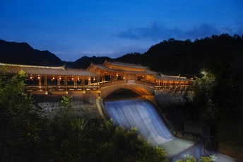 清清溪水汇聚成九龙湖。湖畔建有一座木拱廊桥,称为九龙廊桥。