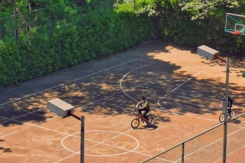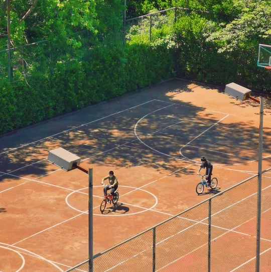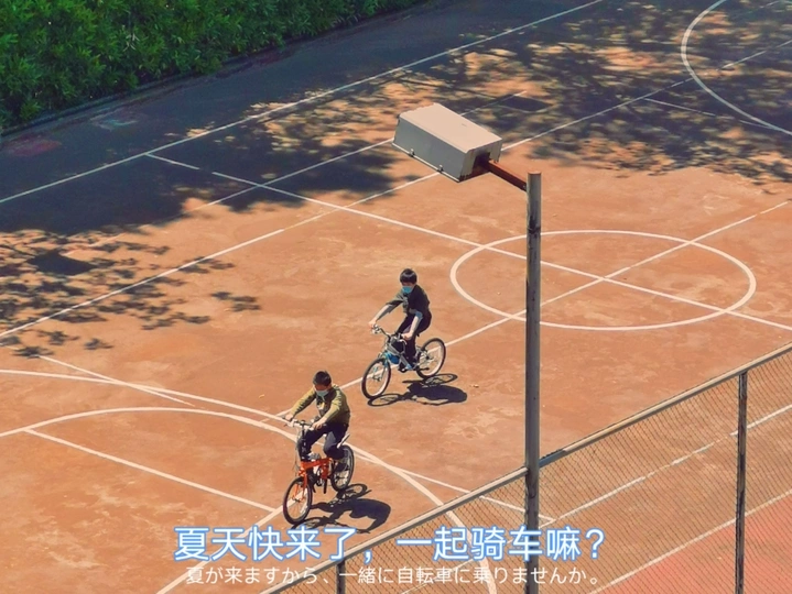 温度慢慢升高,夏天快来了,篮球场上骑着自行车的两个少年,满满的日剧感。