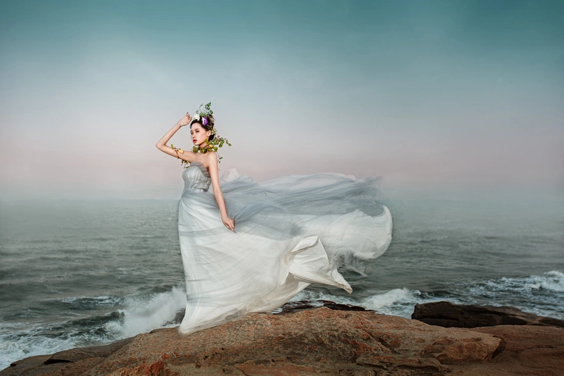 拍摄当天海边台风,模特站在石头上直接被吹的站不稳,头上造型什么的都没原样了。
