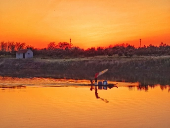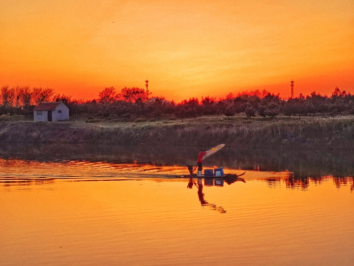 日暮西山,渔民驶着小船一把一把的撒着饲料。这应该是我今年见过最美的画面之一。