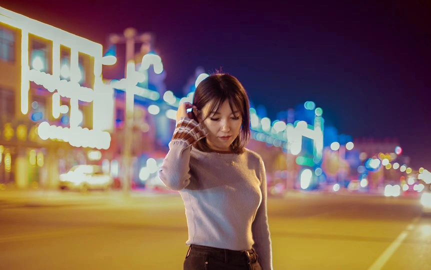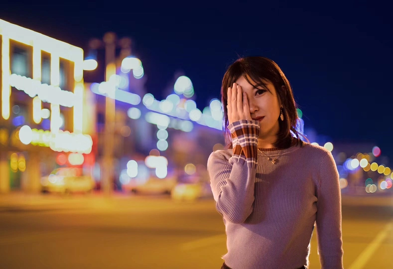这街道亮起灿烂的灯火,宛如你眼里的星辰大海。 摄影后期仰望,出镜小青。
