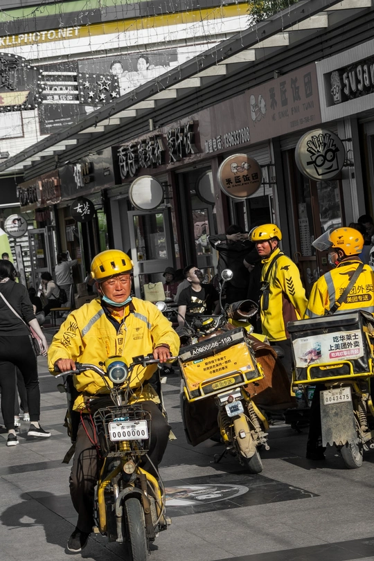 穿梭在拥挤美食街里的外卖小哥