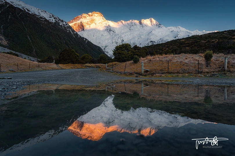 《水坑边的日照金山》在车上冻了一晚上,早早的起床,来到了车旁的小水坑,拍下了这张日照金山…