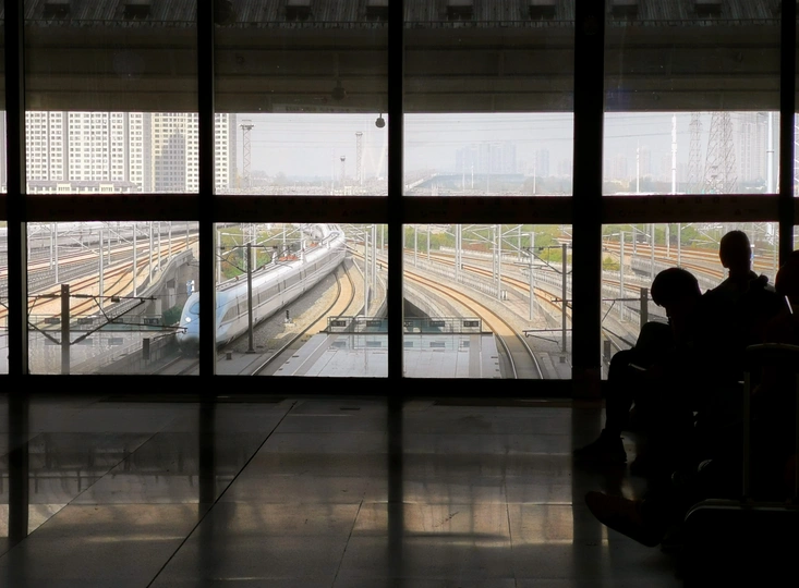 独特的视角,透过候车室的落地大窗看高铁列车进站。