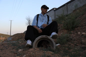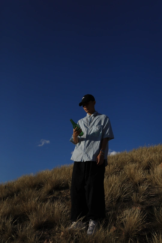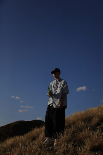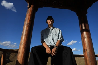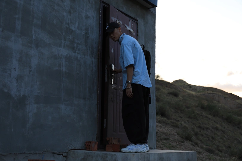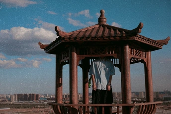 内蒙古的山长满了草,山上的凉亭格外凉爽,山下的水泥房独具一格