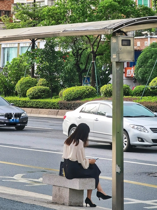 马路上车流穿梭,她坐公共汽车站玩着手机等候着……