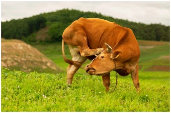 6月的绿江村,草绿水清,黄牛在草地上悠闲地吃草,苍蝇看不得它的舒适和悠闲,组团上来侵扰,黄牛松动松动皮肤、甩打尾巴,无济于事之下,遂扭动脖子、抬起后蹄,自顾自滴挠了起来