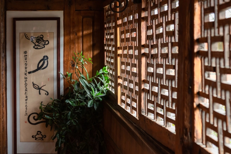 云南丽江一家客栈的走廊,纳西族东巴象形文书法——“海纳百川,有容乃大”。