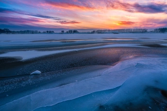 吉林雾凇岛日落,整个河面的冰和水相互交替。