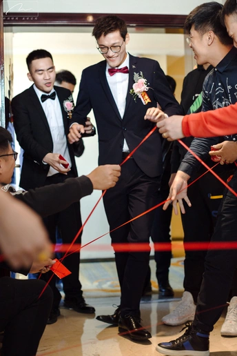结婚当天 新郎需经过种种考验 种种关卡 像极了他们的爱情经历过的九九八十一难
