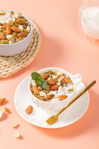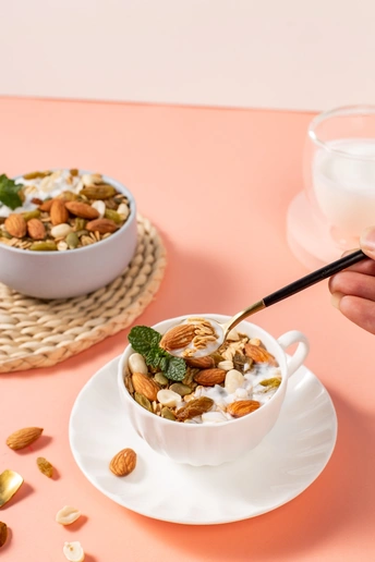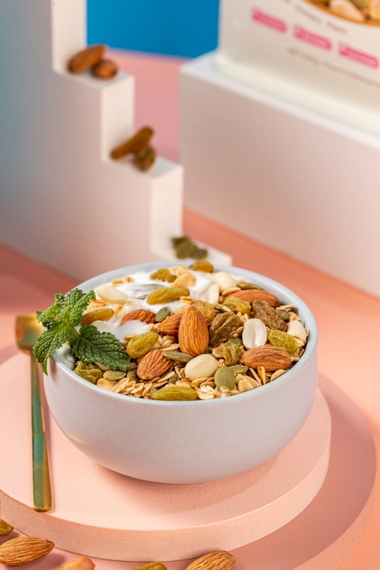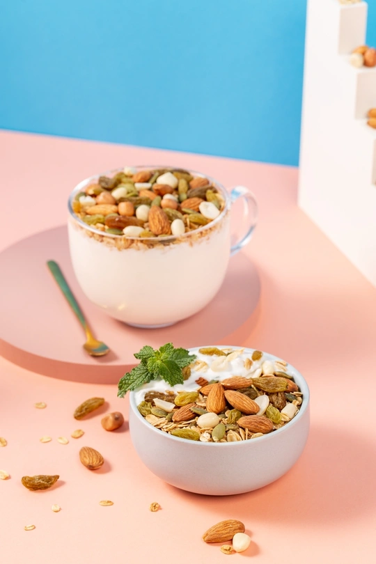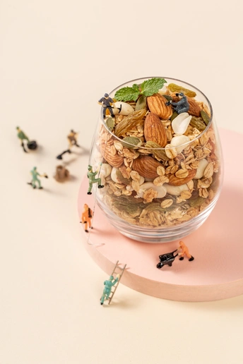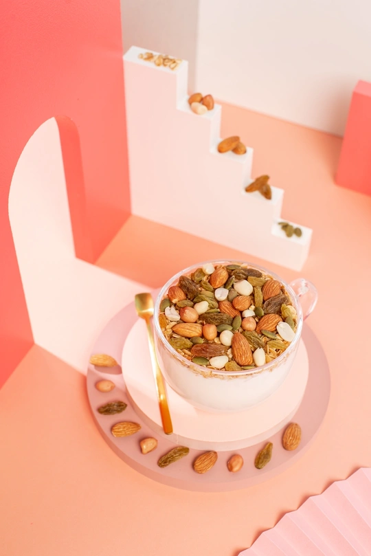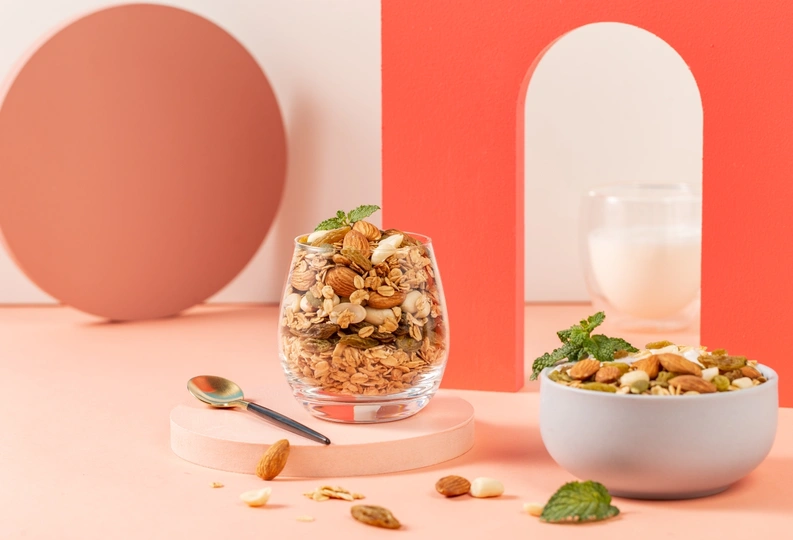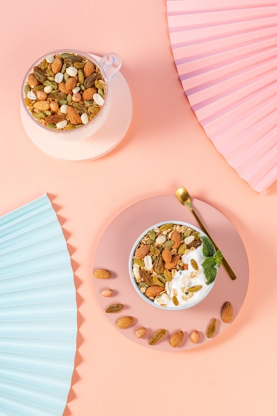 纯色背景搭配几何创意体和燕麦片组合,呈现简约时尚视觉效果。
