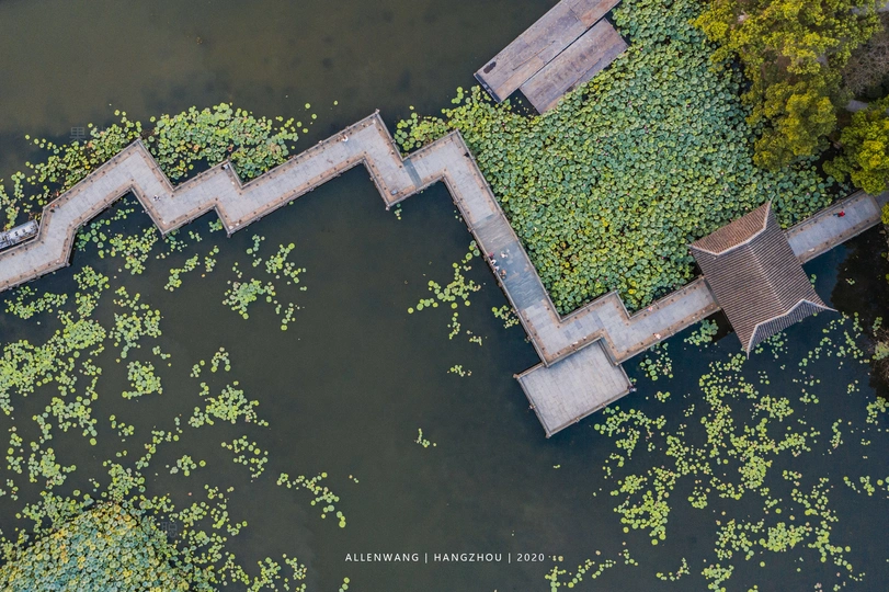 映日荷花别样红。 从空中俯瞰,曲院风荷像是被绿色的玻璃弹珠包裹着一样,着实好看