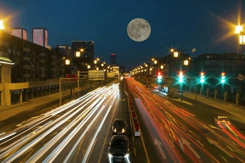 刚开通的道路上车流奔腾不息 与夜空中一轮明月构成美丽的画面
