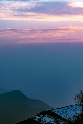 从一高台出,沿步道前行不到十分钟,路边斜坡缓缓倾向山崖,崖边一小舍,只露出白雪皑皑的屋顶,折射出天空奇妙变换的绛蓝色,坡上两颗小树像是默默的矗立在屋面,守护着小屋,不畏风雪严寒,树下灌木大多被风雪压折了身。 远处群山,紫雾缭绕,只显山影不显木;高处天空时而漏光流云,时而彤霞层叠,变幻无穷。而两颗小树远观是枯树空枝,细察则冰枝凝晶,收光聚影,金灿熠熠。这是怎样的奇木非叫人细心观察,方显他的仙气。