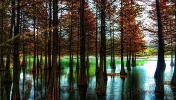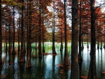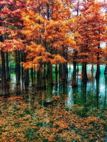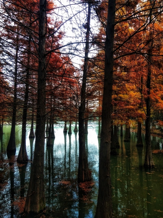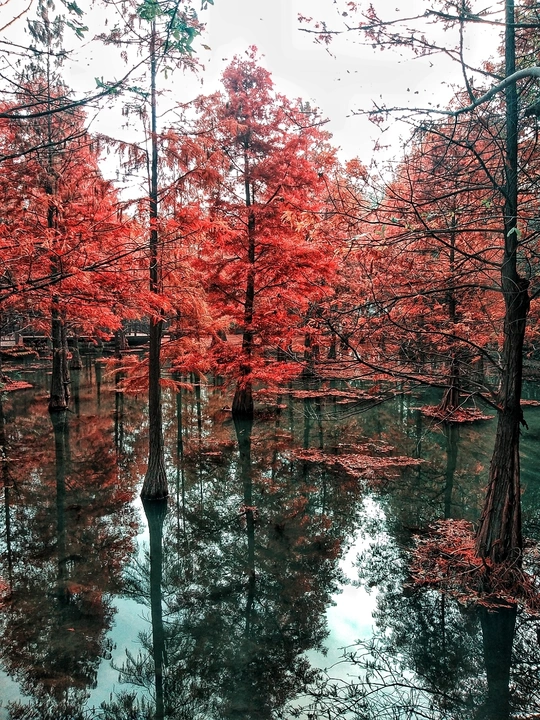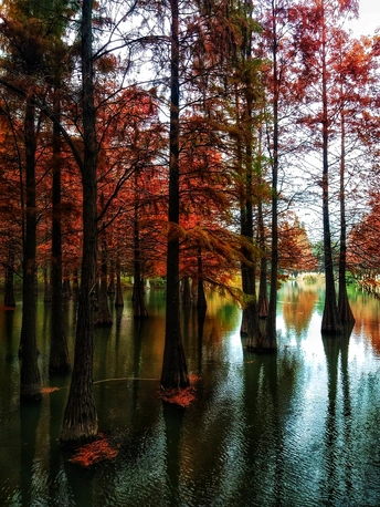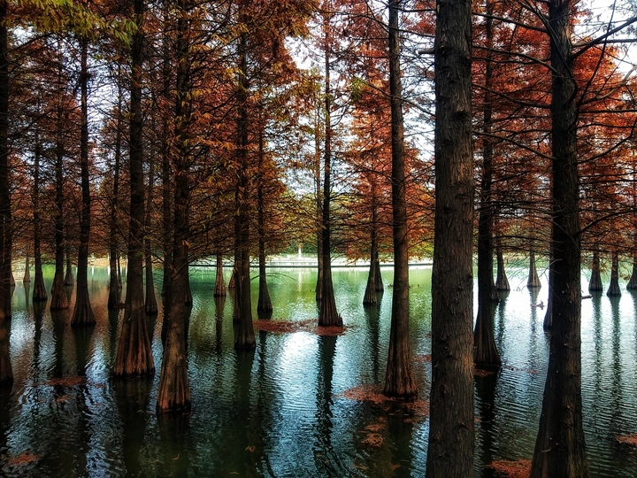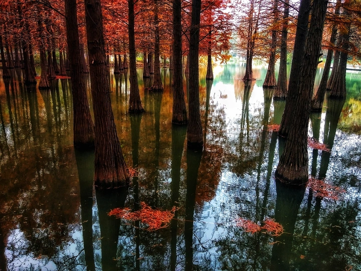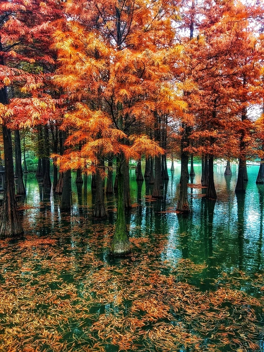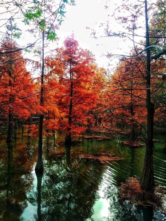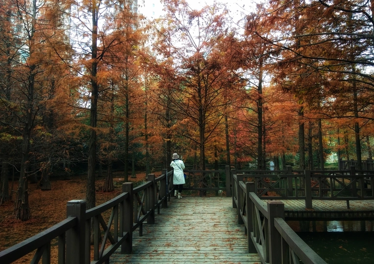 初冬时分,繁华落尽,唯有公园里的水杉层林尽染,如油画般渲染,撑起寒冷里的一片温暖。