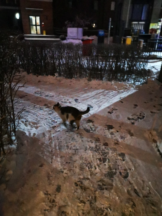 10点多钟吧应该是,我往家走,天也下雪了,走着走着到了小区院里,发现有只流浪猫,这只猫竟然不怎么怕人,在我前面走,走着走着放慢速度了,跟我并排走,我心里说实话挺不得劲的,毕竟这么晚了,我也不由自主的害怕啦,毕竟是猫这种动物给我感觉很邪性,还是只野猫。我就害怕,走着走着这只猫走在我前头,时不时还慢些,接下来它的骚操作我就有点哭笑不得了,我手机拎着东西我也不敢走快,走在它前头,它在前头竟然停下来嘘嘘,顿时我懵了,其实我很担心这只猫嘘嘘的时候,不知道公猫母猫,尿泚的远不远。好担心泚到我这里,我的身上。好怕怕,好担心。我也不敢走太远,让只猫给尾随了呢,我又同时好奇这只猫要去何方。然后走走这只猫抄小道跟我分开走了,但是步伐基本同步,就是相隔路程远些。扭头还是会看到这只猫。走到单元门,我的鞋也担心踩到不干净的东西,例如猫的排泄物,天很黑,看不到脚下有啥。我本人也很洁癖。连续在雪里蹭了好几下鞋。走进单元门,上电梯,到了门口,还是觉得自己的鞋不干净了。担忧啊。。。。