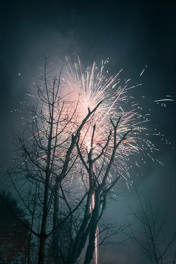 烟花从树的后上方飞起,然后绚烂地炸裂开来,在青蓝的天空绽放成一朵朵光的花朵。火树银花是这样的不?