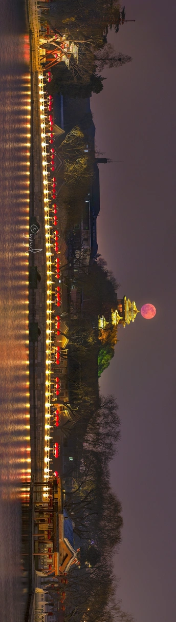 北京,从北海公园里的永安桥上望过去,一轮红月升起在景山公园的万春亭上!
