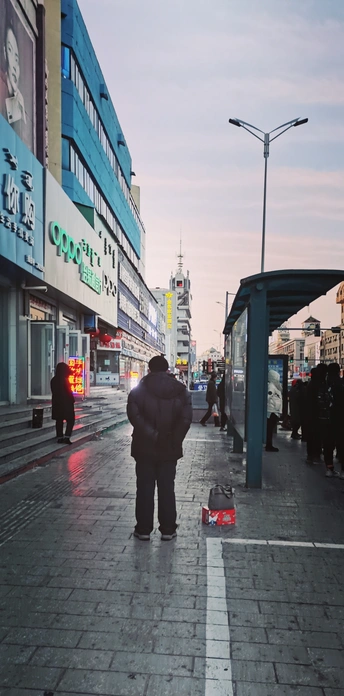 一个老者在公交站旁矗立着,翘首盼望