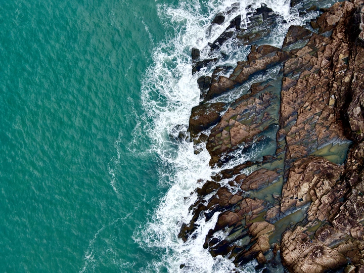 航拍的一张海边的照片,三角形的礁石和海浪还蛮配的