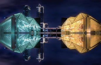 在深圳图书馆10张接片完成的全景图 深圳图书馆左边是冷色调的灯右边是暖色调的灯 挺有对比的感觉的