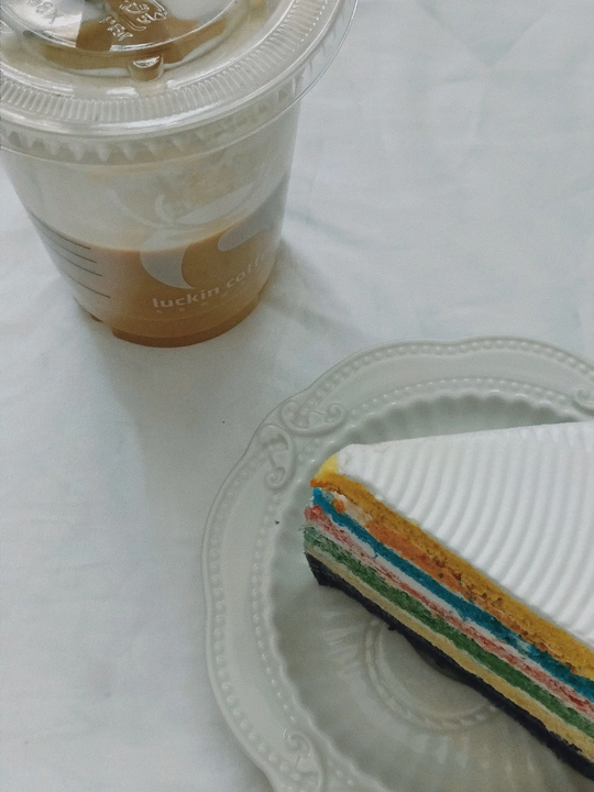 美好一天的开始——早餐 瑞幸(9.9¥)海盐芝士厚乳拿铁☕ 彩虹蛋糕🎂