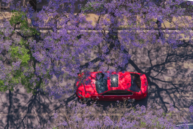 行驶在蓝花楹下的汽车 颜色对比 光影