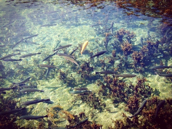 雪山脚下月亮湖,清澈见底,鱼群自在,心亦自在。