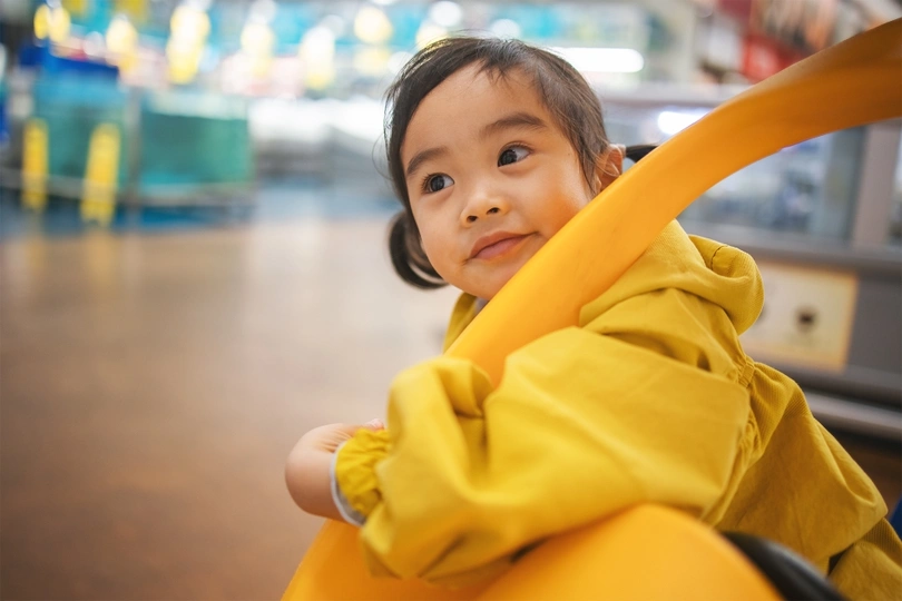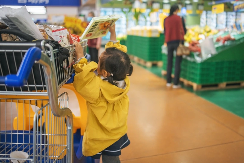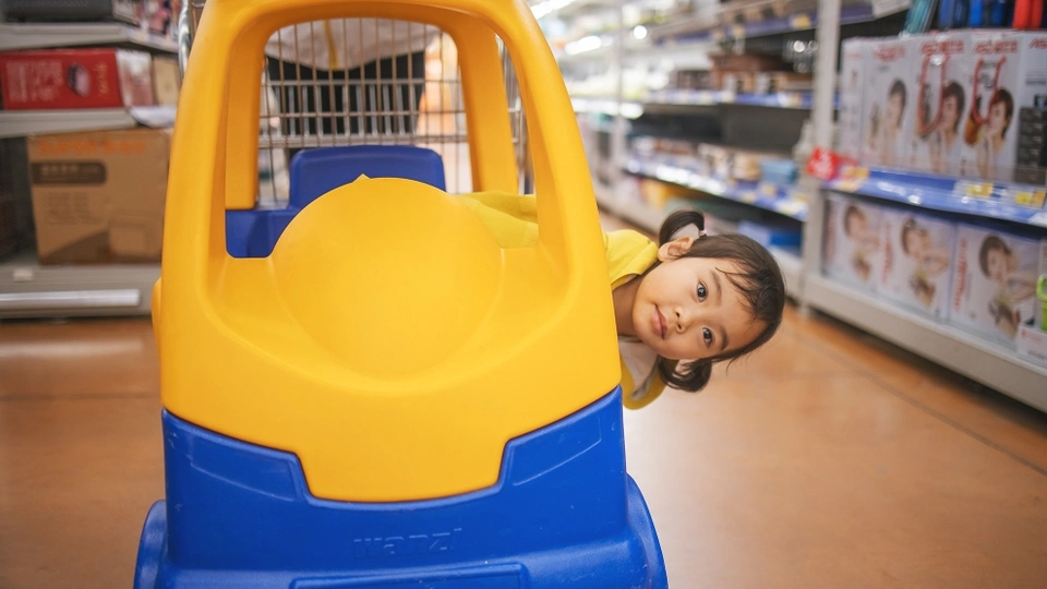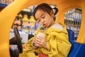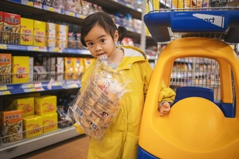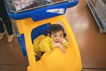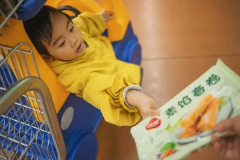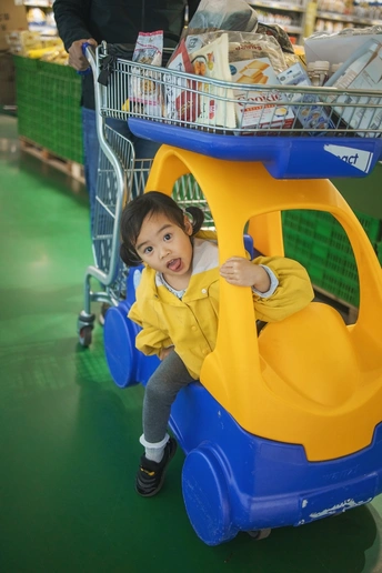 逛超市的小卷始终不肯离开她心爱的儿童购物车半步