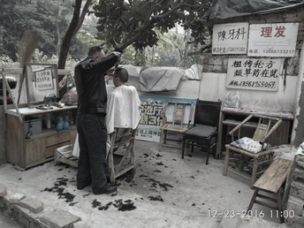 在即将拆迁的沙河边,已有几十年的路边理发摊,不知道还能存在多久。