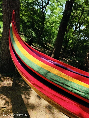 去公园玩,看到一个绑在树上的秋千,阳光透过树叶的间隙正好洒在彩色的秋千上,在四周暗绿的树荫衬托下,秋千显得越发鲜亮,远看就像一抹林中的彩虹。 秋千是细长条状的,如果用常规横平竖直的方法拍摄,总感觉难免拍到很多其他不相关的元素,不是树木太多就是地面太多,秋千占画面比例不够大。于是我采用了不规则构图: 1、打开手机超广角,用超广角拍到尽可能多的秋千信息。 2、把摄像头尽量靠近秋千的一角。超广角会让处于照片四个角位置的画面元素产生一定的形变,进一步夸大秋千在画面中的视觉元素。 3、放低机位,调整构图,把秋千放在画面对角中线位置,让秋千成为绝对的视觉中心。