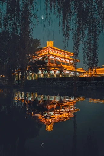 夜晚,仿古建筑与倒影