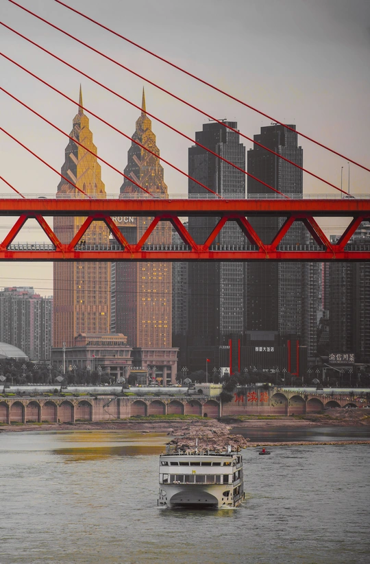 漫步在南滨路上总会能给我一些小惊喜❤️我发现来这边我爱上了这栋金色的大楼,也就是喜来登大酒店。无论我走到哪我都会控制不住的盯着他拍 · 下面我给大家分享下拍照攻略? · 【拍摄攻略】 ❶我是从弹子石码头的方向往龙门浩街这边也就是桥下走,走到快到桥底的时候就能看到这个角度。此时桥与两栋楼大致平行。 · ❷这边隔几分钟就会有地铁经过,运气好的话还能碰到游轮。当它们都在你的画面中时,同时夕阳照亮金色大楼,那么真的是你真的是天选之子了 · ❸尽量带上长焦镜头?没长焦很难拍到细节,毕竟距离还是有这么远的哦