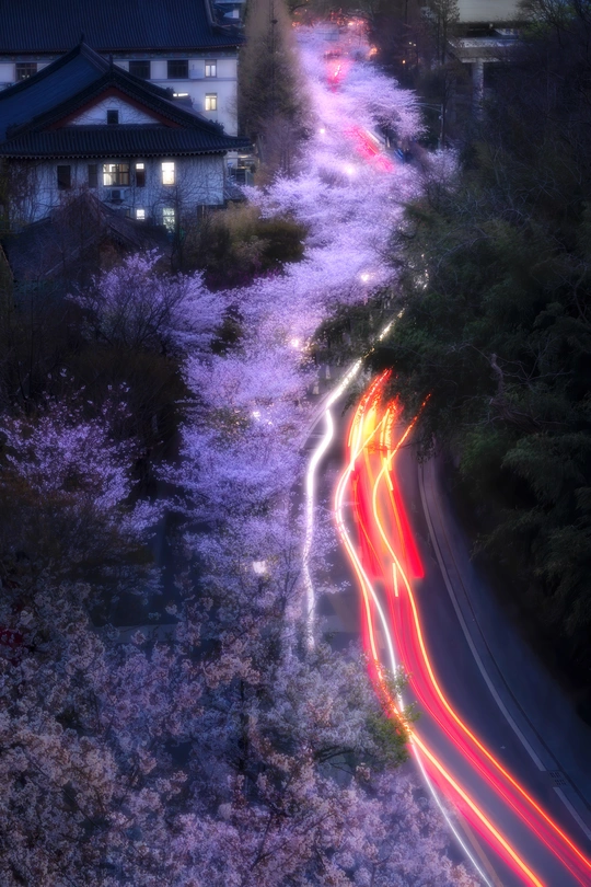 樱花季的南京鸡鸣寺,入夜,彩色车轨与樱花花海交织在一起,美不胜收。