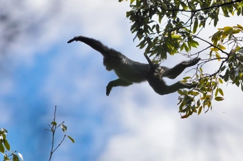 得益于发达的大脑、立体视觉和矫健的肢体,怒江金丝猴 Rhinopithecus strykeri (又称缅甸金丝猴、黑仰鼻猴) 可以灵活地穿梭在高黎贡山动辄20 - 40 m高的林冠层中,跃过相当于自身体长数倍远的林冠间隙并精确抓住对面的枝条,对它们来说如同家常便饭。于三江并流世界遗产地、高黎贡山国家级自然保护区怒江泸水辖区。