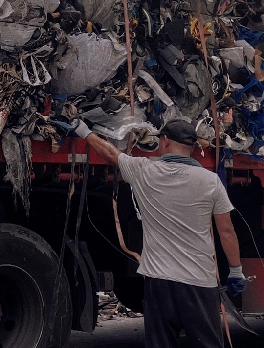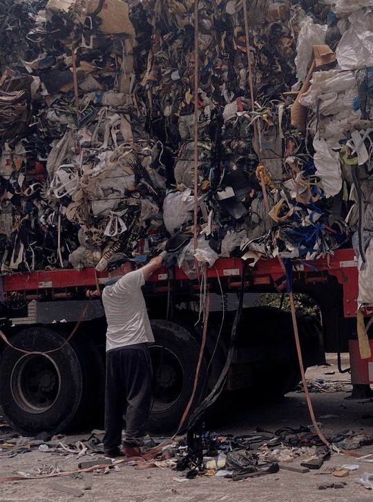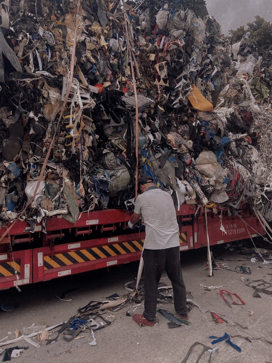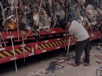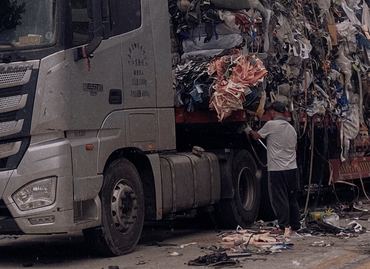两名工人将成堆的工业垃圾绑在大货车上,零零碎碎的掉落一地,相信货车行驶过程中也会到处散落,为了一点点成本就不能换一个密闭的货箱装载吗?便宜了自己,麻烦了别人,鄙视无良的厂商