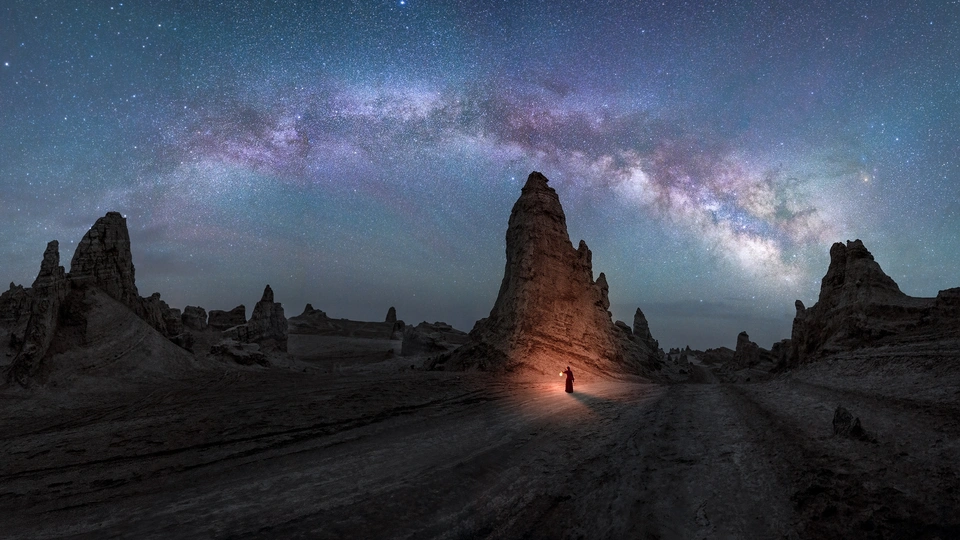 『银河下的火星地貌』摄于俄博梁。银河与地景一体实景拍摄,人与灯光是后期的,拍摄时着急转场,就没让人提灯过去站着,事后还是感觉遗憾。