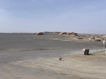 漫漫黄沙里,一头小牛在走着。在大西北,周围显得很空旷干净。地平线向右下滑了滑,小牛向右上走了走。希望它能快点到目的地,哈哈。