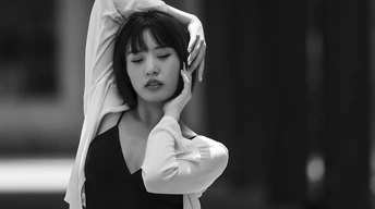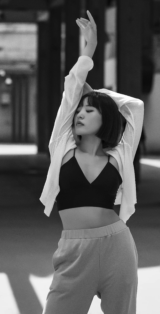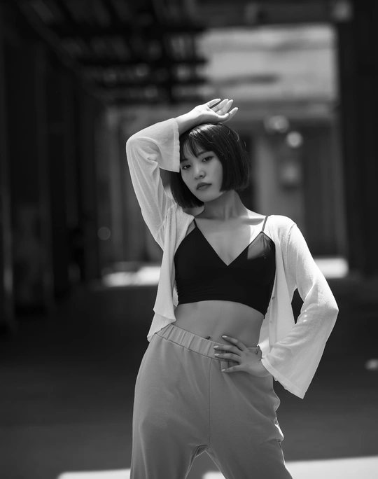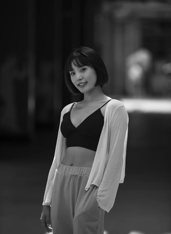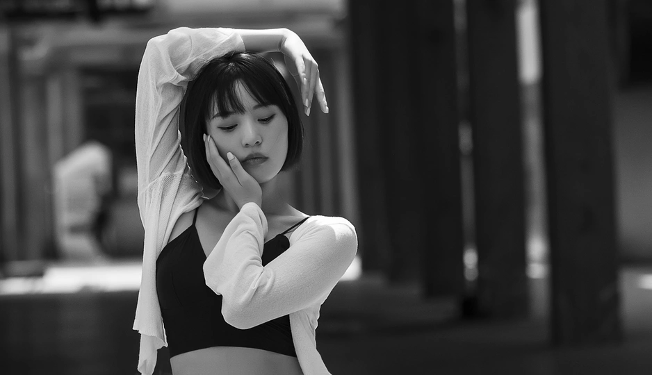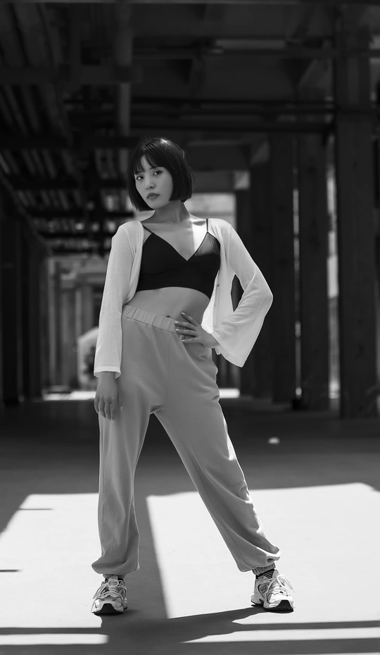 阳光透过东郊工业管道照射到模特身上,造就了这经典的黑白人像